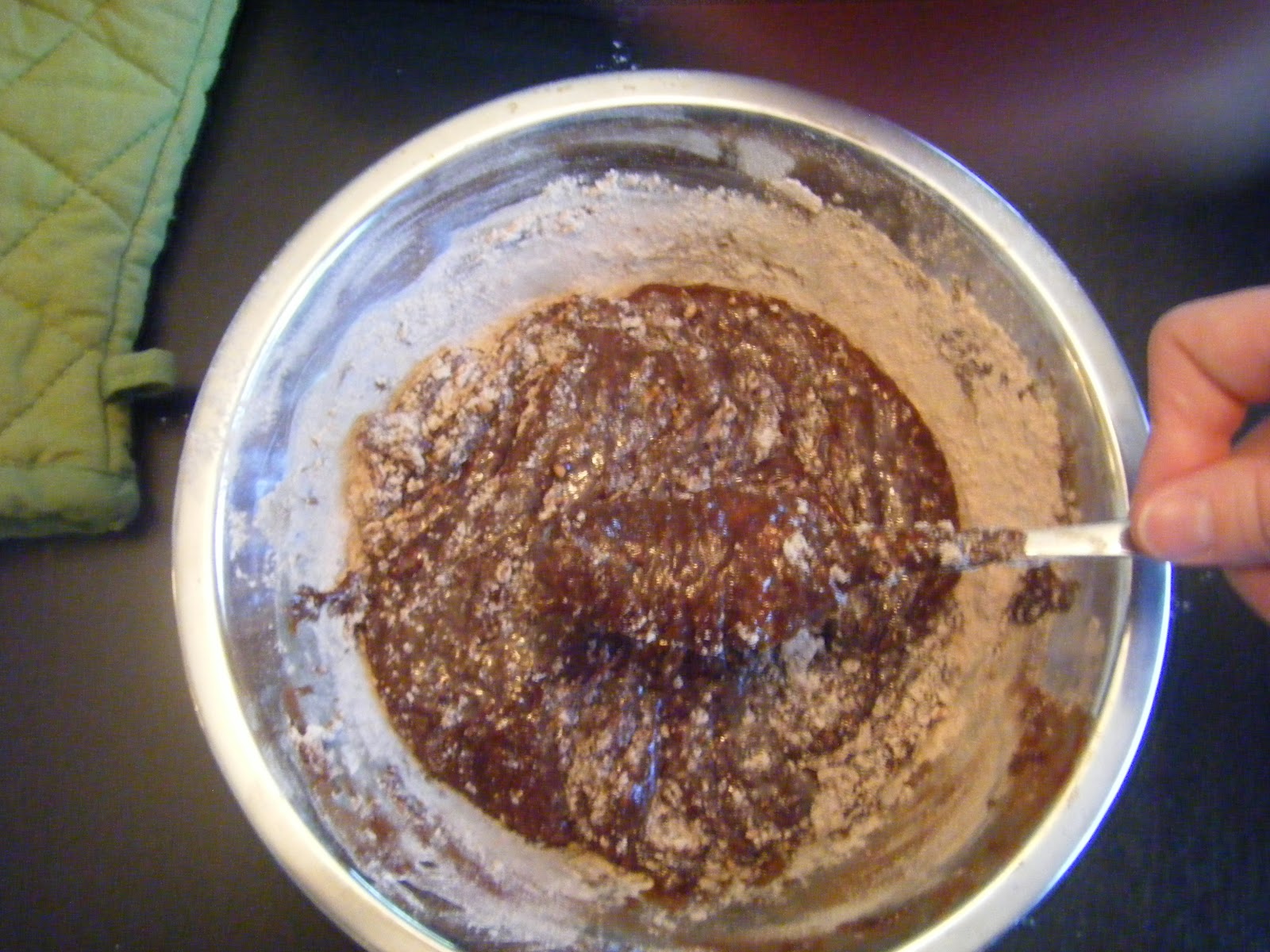 For me the key to getting complex recipes like this done with Bubba around is preparation. I like to measure out all of the ingredients ahead of time so all I have to do is add them in the right order. You can pre-mix some of them together (like eggs and vanilla, and the cocoa powder salt, and flour)