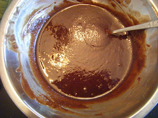 First melt one stick of butter and about one cup (6 oz) of chocolate chips with the burner on medium- low heat. (The trick is to get it just warm enough to melt the chocolate and butter--we don't need to cook it.)